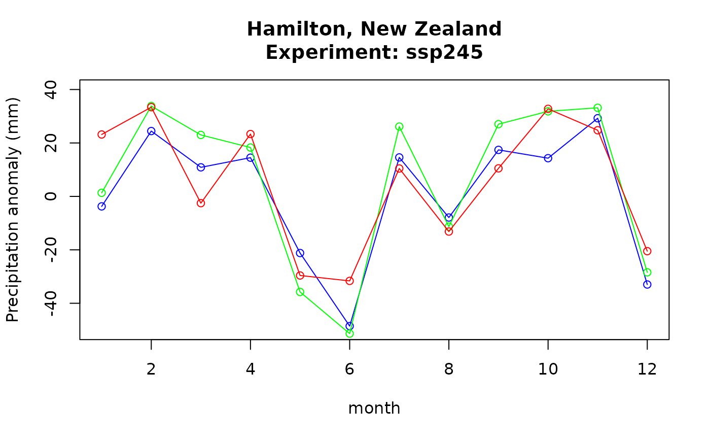 Here we simply compute the average of the monthly precipitation anomaly over the ensemble members. In a more typical scenario, you would use the values from the individual models and to apply a more suitable analysis, such as calculating the confidence interval or model agreement.