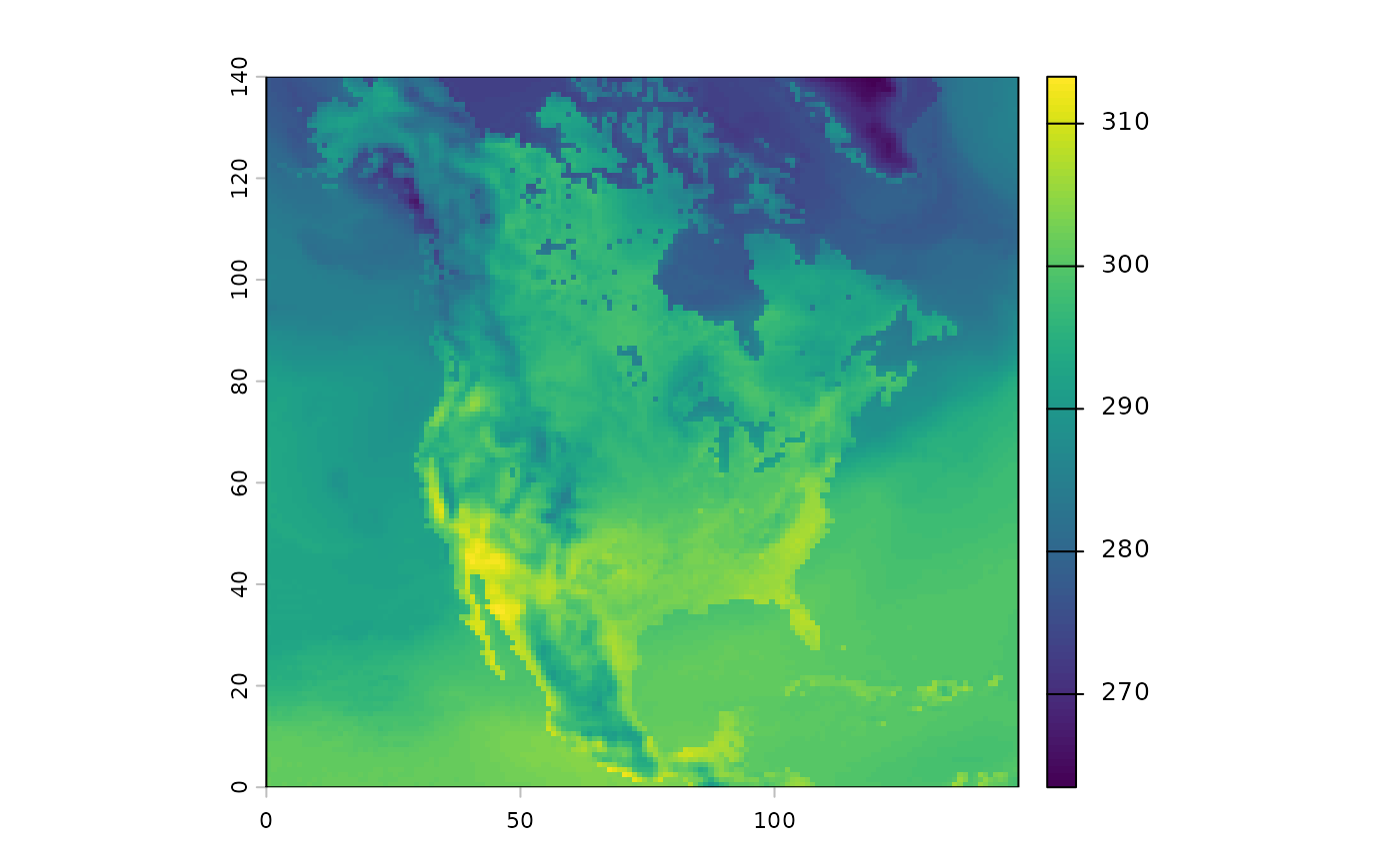 Ok, so now we got North America looking pretty ok again. The data has been oriented in the right way. Behind the scenes that may have involved transposing and flipping the data, depending on the data storage arrangement in the netCDF resource.